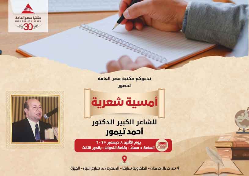 في ليلة مميزة من ليالي الأدب والفن، تستضيف مكتبة مصر العامة يوم الاثنين 8 ديسمبر 2025 الساعة 5 مساءً أمسية شعرية راقية يحييها الشاعر الكبير أحمد تيمور، أحد أبرز الأصوات الشعرية المعاصرة.