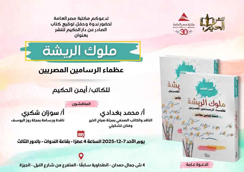 استضافت مكتبة مصر العامة يوم الأحد 7 ديسمبر 2025 في تمام الرابعة عصرًا واحدة من أهم الفعاليات الفنية، وهي ندوة وحفل توقيع كتاب: