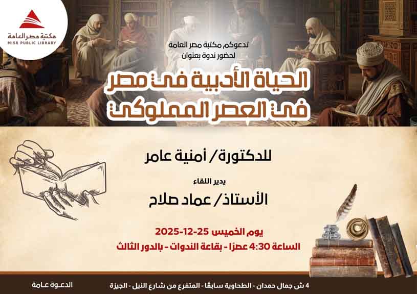 قراءة في التراث الأدبي وتحولات المجتمع في إطار رسالتها الرامية إلى إحياء التراث الثقافي المصري وتعميق الوعي بتاريخ الأدب العربي، نظّمت المكتبة يوم الخميس الموافق 25 ديسمبر 2025 ندوة ثقافية موسعة بعنوان «الحياة الأدبية في مصر في العصر المملوكي»، وذلك في تمام الساعة الرابعة عصرًا، بحضور نخبة من المهتمين بالأدب والتاريخ والباحثين الشباب.