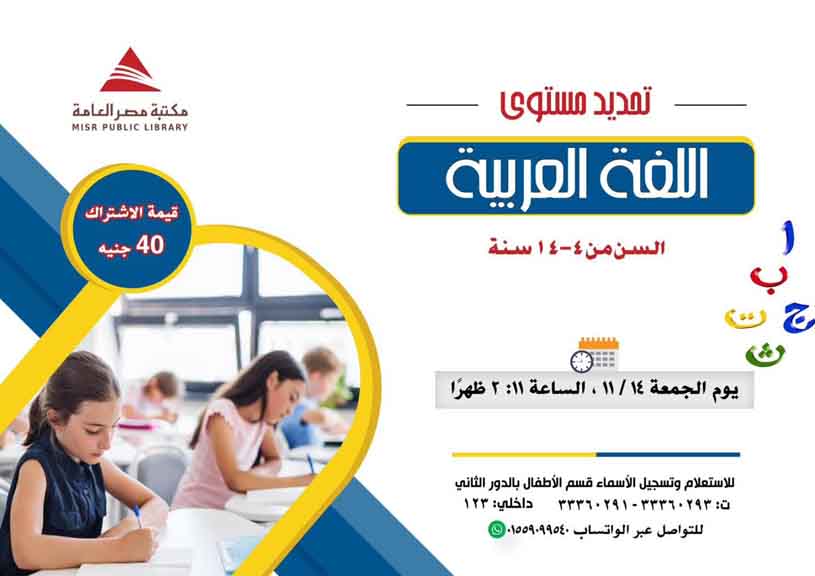 وفي إطار دعم مهارات اللغة لدى الأطفال وتنمية قدراتهم اللغوية، تُعلن مكتبة مصر العامة عن فتح باب التسجيل لـ اختبار تحديد مستوى اللغة العربية، والموجّه للفئة العمرية من 4 إلى 14 عامًا.