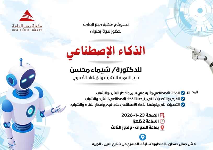 في عالم يتغير بسرعة غير مسبوقة، تنظم مكتبة مصر العامة ندوة بعنوان: