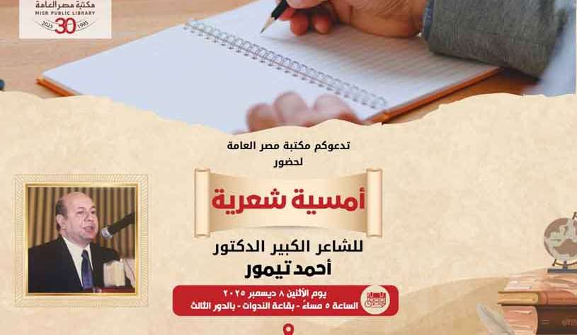 أمسية أدبية شعرية مع الشاعر الكبير أحمد تيمور – الاثنين 8 ديسمبر…