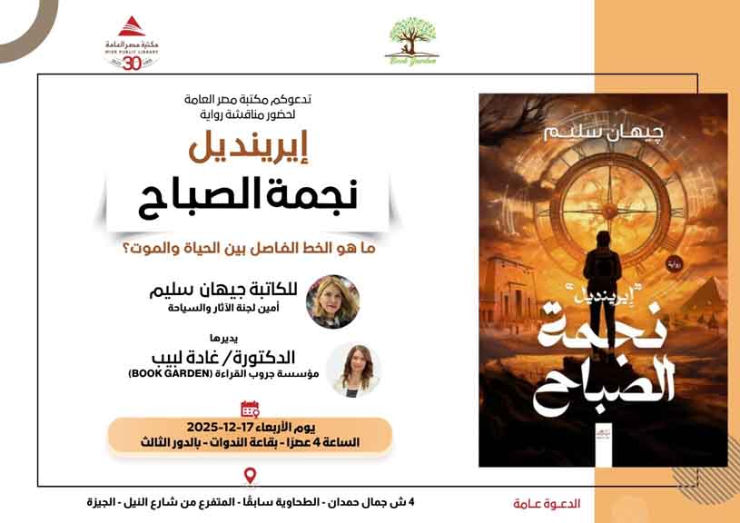 استضافت مكتبة مصر العامة يوم الأربعاء 24 ديسمبر 2025 في تمام الرابعة عصرًا فعالية أدبية مميزة لمناقشة رواية: