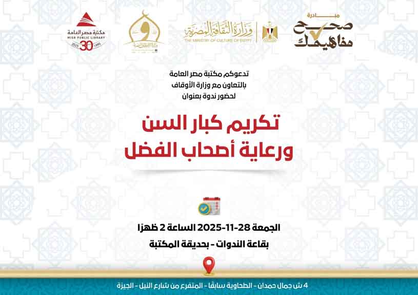 تواصل مكتبة مصر العامة دورها الريادي في نشر الوعي وبناء ثقافة مجتمعية قائمة على الاحترام والقيم الأصيلة، حيث تستضيف يوم الجمعة 28 نوفمبر 2025 في تمام الساعة الثانية ظهرًا ندوة مميزة بعنوان “تكريم كبار السن ورعاية أصحاب الفضل” وذلك بالتعاون مع وزارة الأوقاف ضمن مبادرة صحّح مفاهيمك التي تهدف إلى ترسيخ الأخلاق المجتمعية وتصحيح بعض السلوكيات المتداولة في البيوت المصرية.