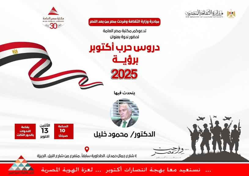 في إطار الاحتفالات بذكرى انتصارات أكتوبر المجيدة، تدعوكم مكتبة مصر العامة للمشاركة في واحدة من ندواتها المميزة التي تُعيد للأذهان أعظم لحظات الفخر والعزة الوطنية 🇪🇬