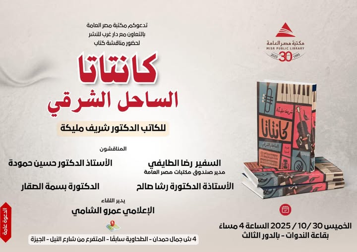في أمسيةٍ من أمسيات الإبداع والفكر، تدعوكم مكتبة مصر العامة بالتعاون مع دار غرب للنشر إلى رحلةٍ فنيةٍ آسرة بين الأدب والموسيقى والفلسفة عبر مناقشة كتاب «كانتاتا الساحل الشرقي»، أحدث إبداعات الكاتب والمفكر الدكتور شريف مليكة.
