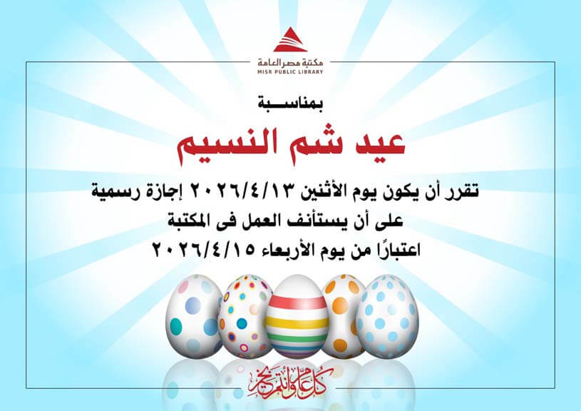 إعلان هام بمناسبة عيد شم النسيم 🌿 تُهنئكم مكتبة مصر العامة (MISR PUBLIC LIBRARY) بحلول 🌼 عيد شم النسيم، متمنين لكم أوقاتًا سعيدة مليئة بالبهجة والسرور.
