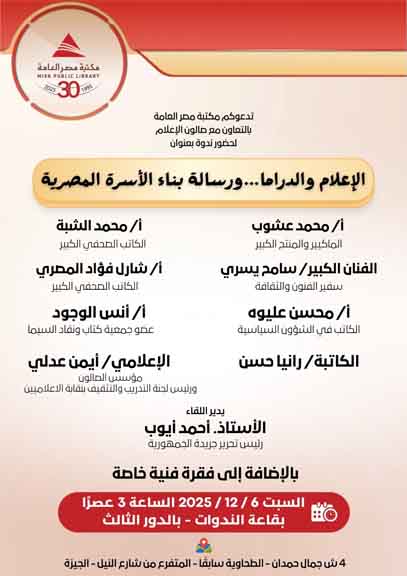 في إطار اهتمام مكتبة مصر العامة بدورها الريادي في تعزيز الوعي المجتمعي وبناء منظومة فكرية وثقافية مستنيرة، نظّمت المكتبة يوم السبت 6 ديسمبر 2025 في تمام الثالثة عصرًا ندوة موسّعة بعنوان: