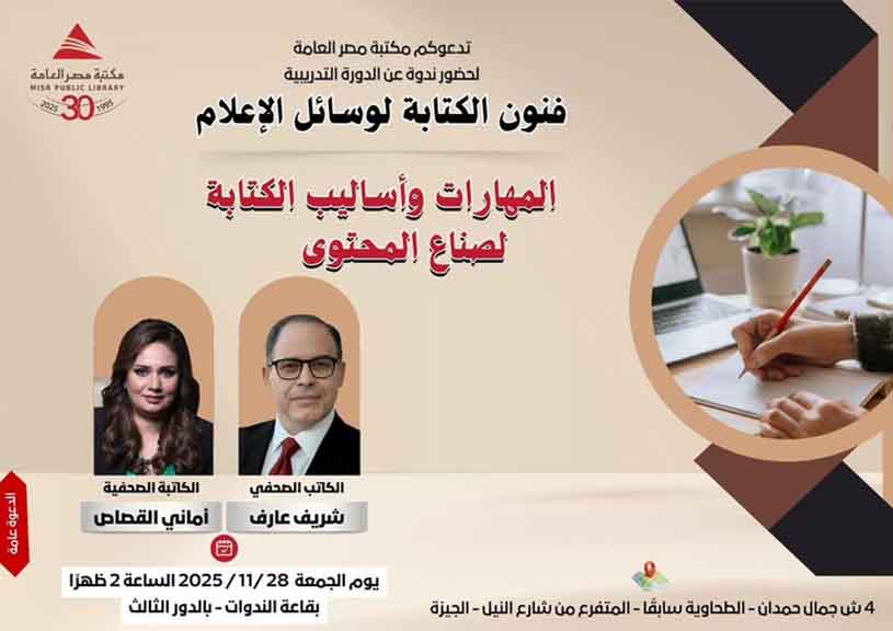 تستضيف مكتبة مصر العامة في الجمعة 28 نوفمبر 2025 – الساعة 2 ظهرًا ورشة تعريفية مهمة تأتي ضمن برنامج تدريبي احترافي بعنوان “المهارات وأساليب الكتابة لصُنّاع المحتوى” يقدمها كلٌّ من الكاتب الصحفي شريف عارف والكاتبة الصحفية أماني القصاص، وهما من أبرز الأسماء في مجال الكتابة الصحفية وصناعة المحتوى.