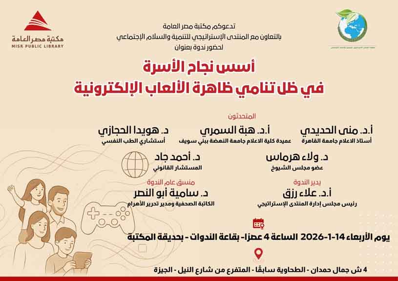تناقش الندوة التأثيرات النفسية والتربوية والاجتماعية للألعاب الإلكترونية، ودورها في تشكيل سلوكيات الأبناء، والعلاقة بين الاستخدام الآمن للتكنولوجيا واستقرار الأسرة، مع تقديم رؤى عملية تساعد الآباء والمربين على بناء بيئة أسرية متوازنة.