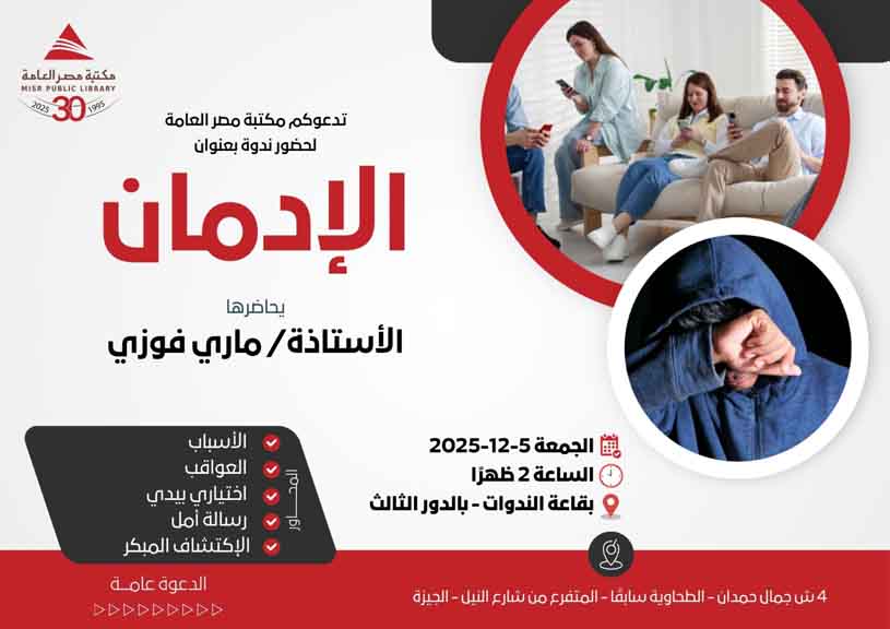 تستضيف مكتبة مصر العامة يوم الجمعة 5 ديسمبر 2025 في تمام الساعة 2 ظهراً