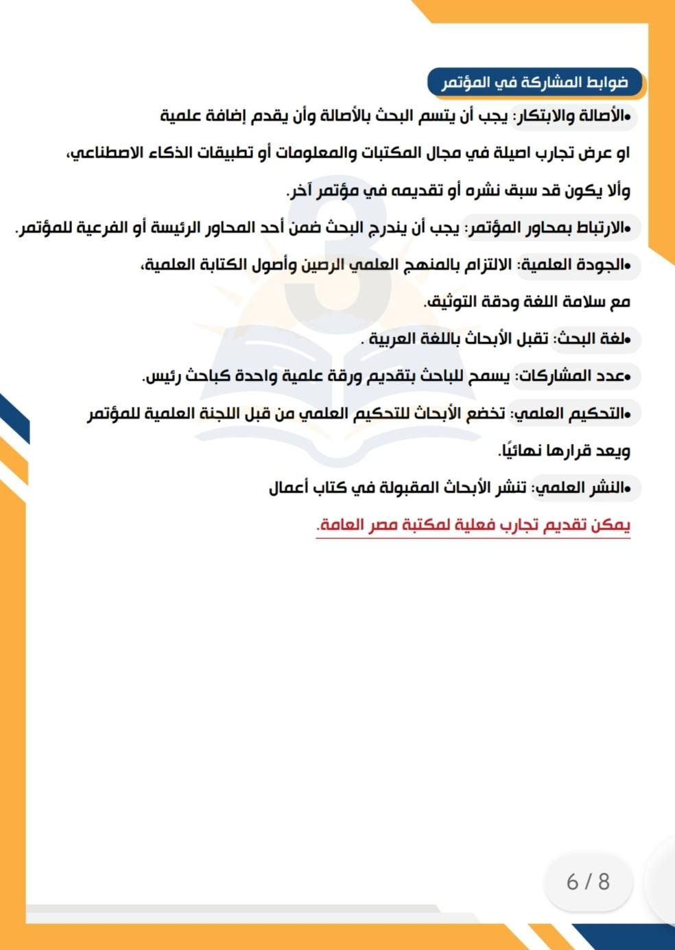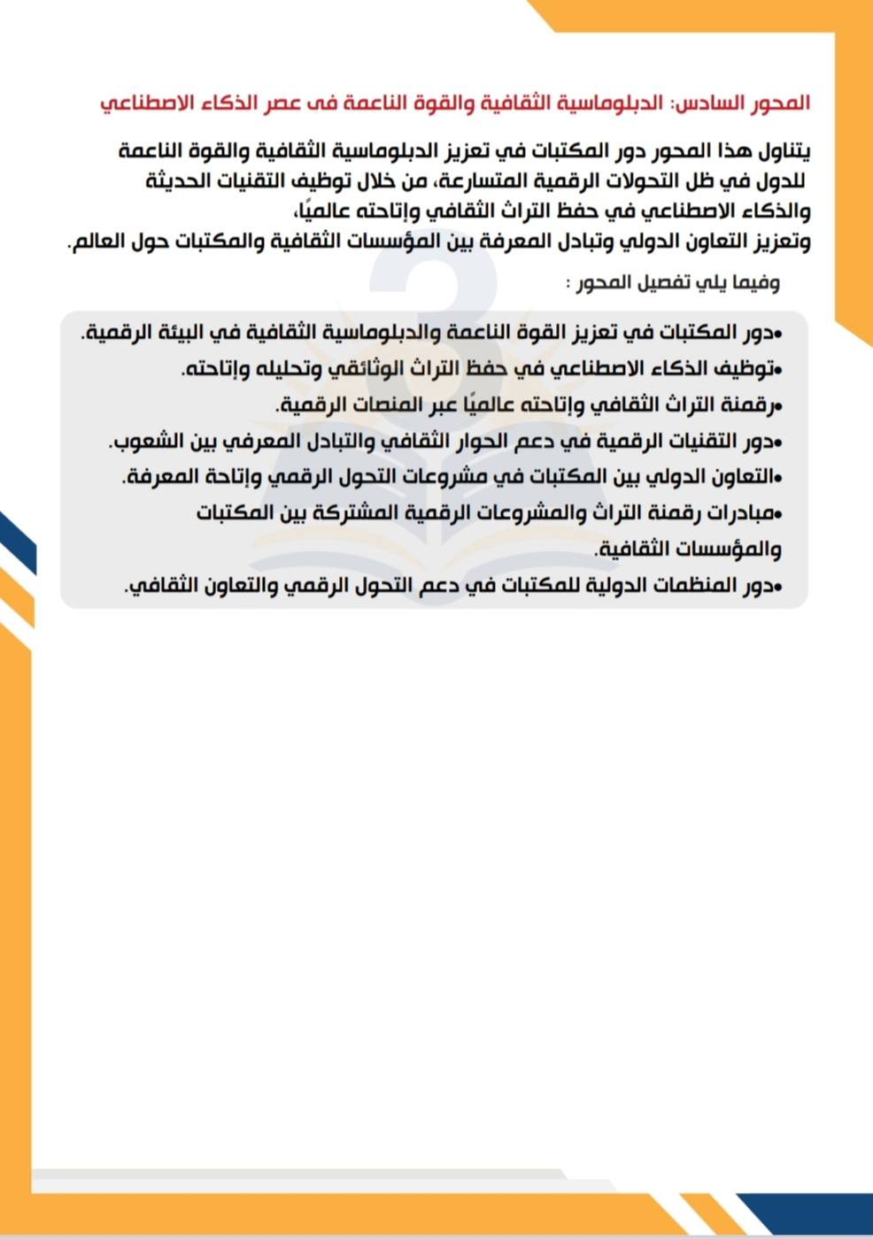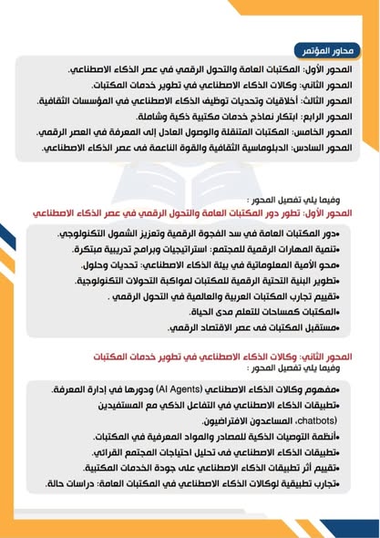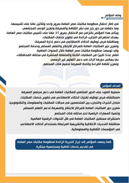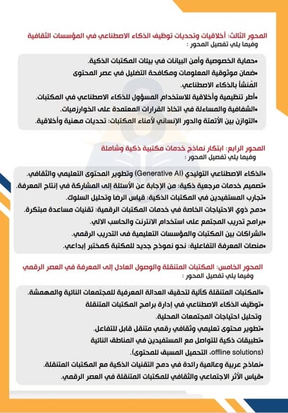 يمثل المؤتمر منصة مهنية تجمع الخبراء والمتخصصين لمناقشة مستقبل المكتبات في عصر الذكاء الاصطناعي، وتبادل الخبرات حول تطوير الخدمات المعرفية، بما يعزز دور المكتبات كمؤسسات ثقافية رائدة تدعم الابتكار والتعليم المستمر.